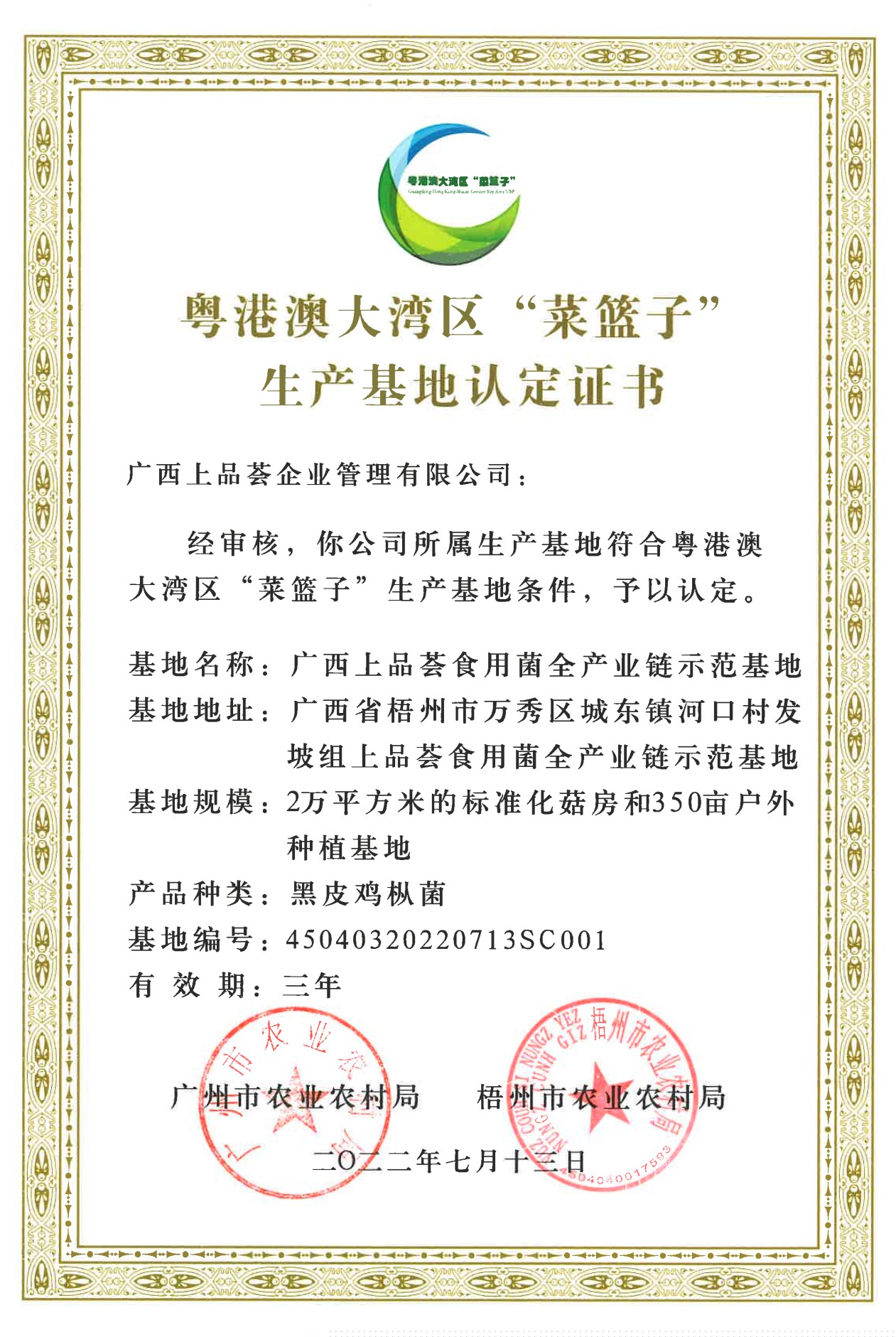 粵港澳區(qū)“菜籃子”生產(chǎn)基地認(rèn)定證書